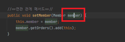 2.Order 클래스의 연관관계 메서드 파라미터에서 오타 있습니다.
