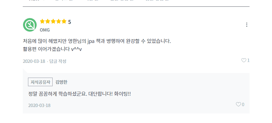 이건 저의 경험이고 개개인마다 학습 능력치가 다르기 때문에 wisehero님께서는 활용1편을 보더라도 이해가 되실 수도 있고 안되실 수도 있기 때문에 "무조건 책까지 구매하세요" 라고 말씀드리지는 못하겠지만 영한님의 JPA 책은 JPA 전체 시리즈의 집합이라고 말씀 드릴 수는 있습니다.