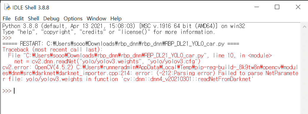 yolo/yolo3.weights가 없는 것 같은데요. 마찬가지로 . cfg도 있어ㅑ합니다. 아마도 웹 페이지에 받아서, 프로젝트 폴더에 하위 디렉토리 yolo만들어서 파일 넣으면 됩니다.