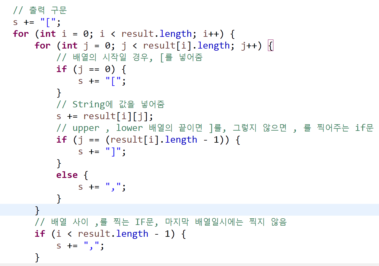 //upper , lower 배열의 끝이면 ]를, 그렇지 않으면 , 를 찍어주는 if문