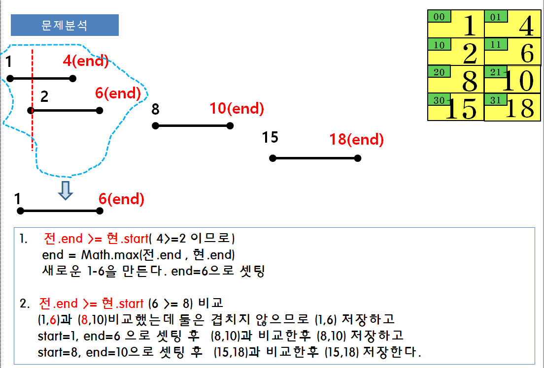 8:54초경 문제분석 2 설명을 보면 다시전 end > 현 start 비교해서 6>=8이 아니므로 [8,10]을 저장한다고 말씀하시는데