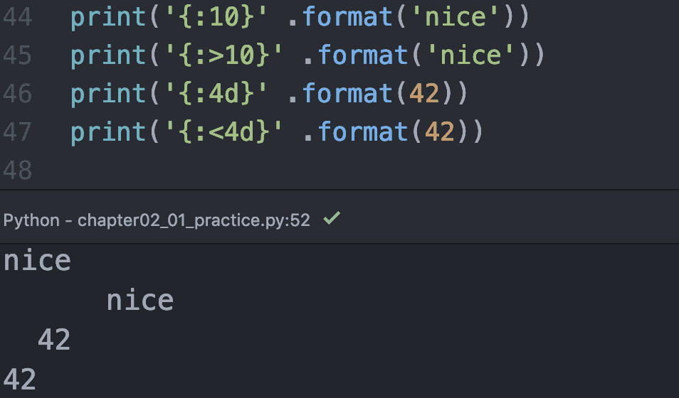 정수의 경우에는 :과 숫자 사이에 아무런 기호를 넣지 않으면 자동으로 우측 정렬이 됩니다.