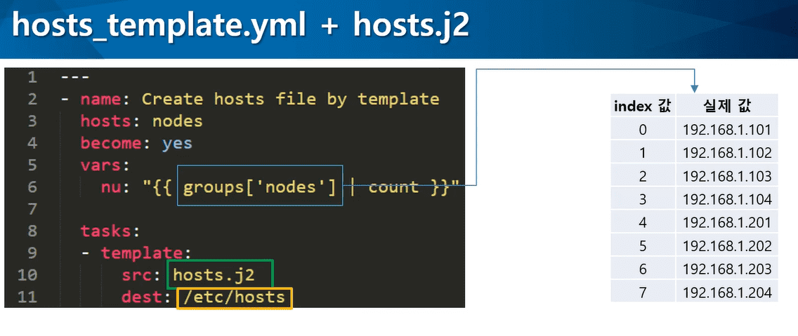 group['nodes']에 의해서 index값에 실제 IP 값이 맵핑되어있다고 설명해주셨는데 이 부분이 잘 이해가 되질 않습니다. 직접 맵핑해준적도 없는데 group['nodes']가 facts인자인건지 아니면 다른 어디에 맵핑된건지 궁금하네요.