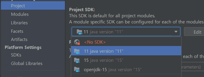 file -> project structure -> Project와 SDKs에서 아래의 사진과 같이 변경하였습니다.
