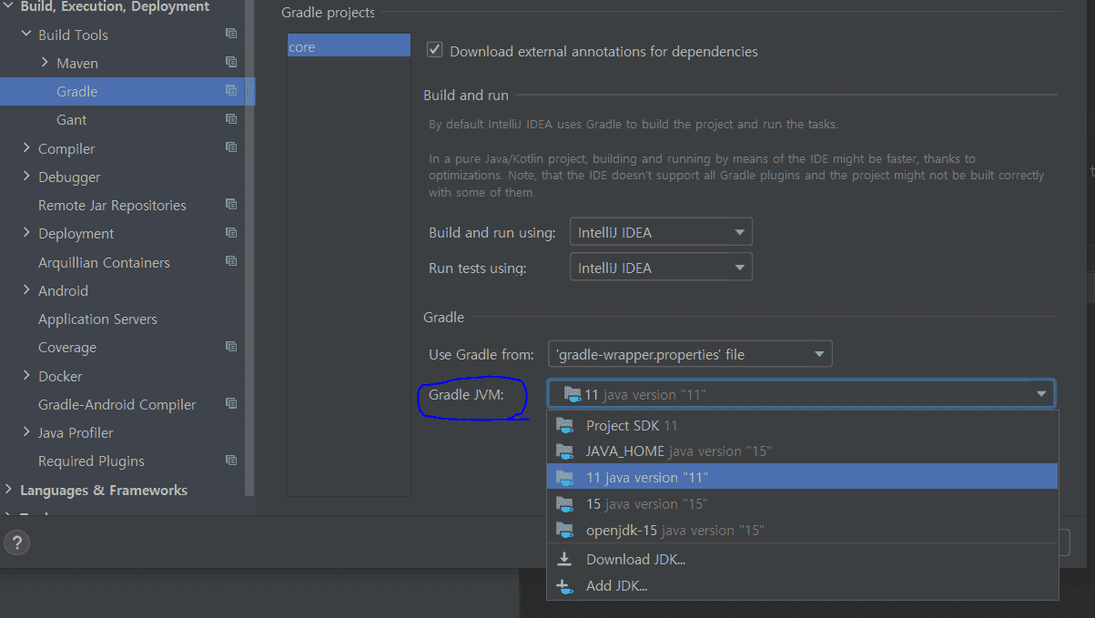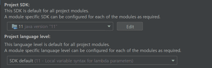 Gradle JVM의 칸에 아무것도 없다고 하여 Gradle JVM에 11을 선택했습니다.