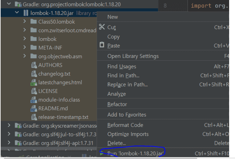 external library에서 lombok을 검색하여 run을 눌러봤습니다.