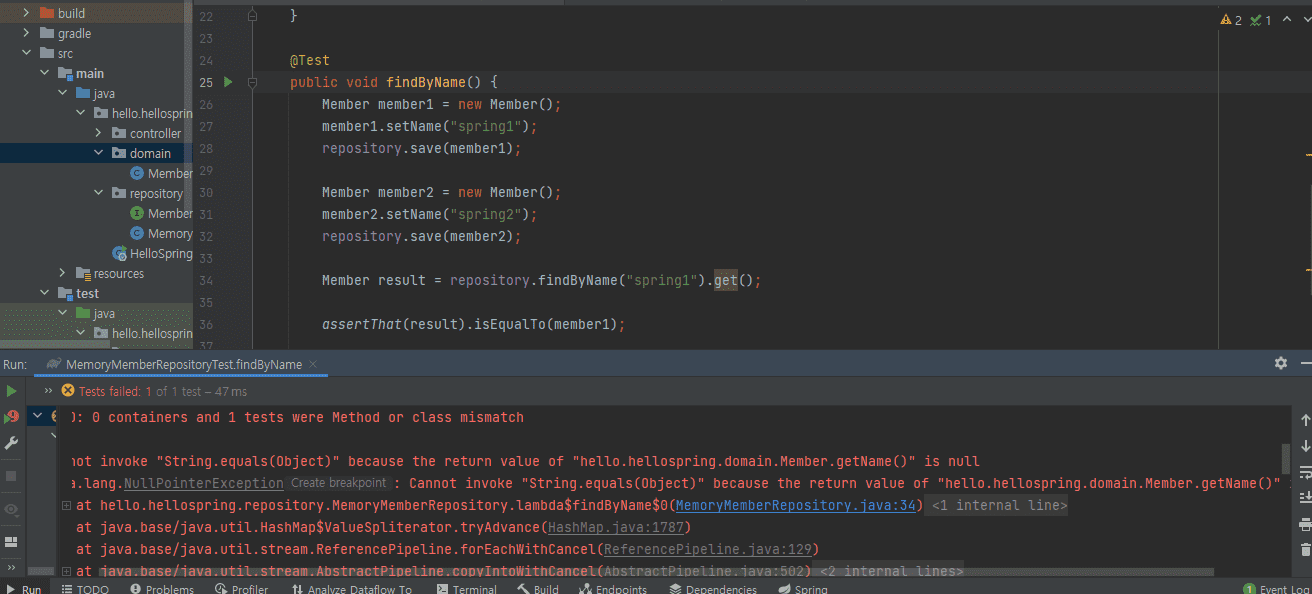 안녕하세요 수업 잘 듣고 있습니ㅏㄷ! 다름이 아니라 제가 코드를 따라썼는데 똑같은데도아래와 같이 에러가 나서요..! test파일 말고 main파일에서 오류가 있는 것 같아서 선생님 코드 붙여넣었는데도 똑같은 오류가 나네요 왜그러는 걸까요 ㅠㅜㅠ 첫번째 사진은 테스트 진행시 오류사항이고요, 두번째 사진은 main의 Memory member Repository 부분 올리겠습니다!