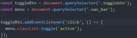 1. 하나는 토글 메뉴바를 눌렀을 때 메뉴가 펼쳐지는 자바스크립트 코드이고,