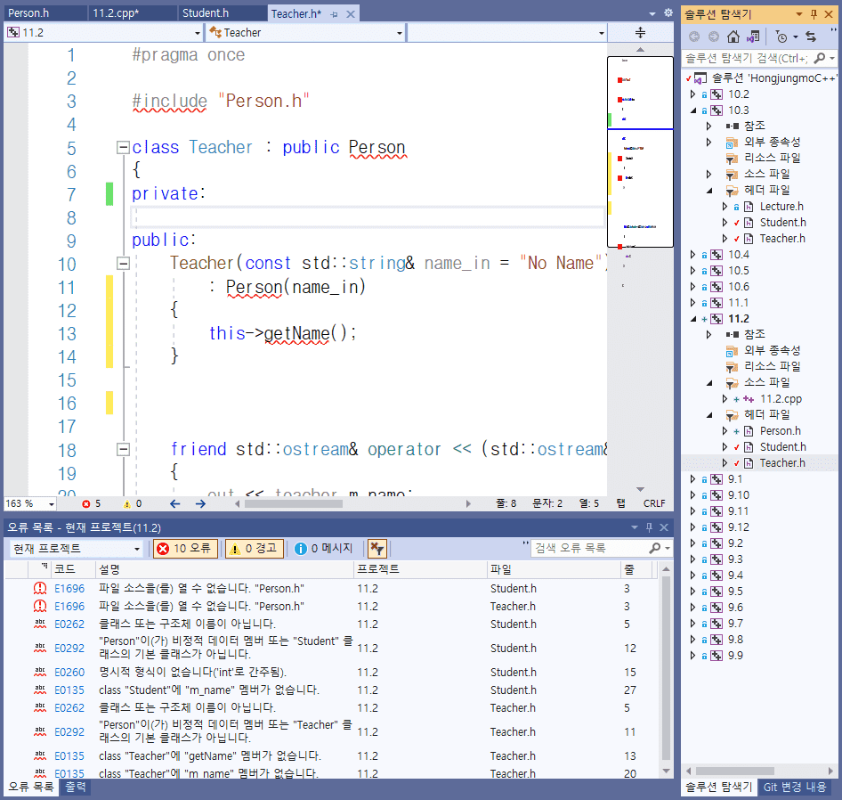 teacher.h, student.h 파일이 person.h를 include하는 구조인데 person.h 에서 string과 iostream을 include 하는 부분부터 에러가 떠서 파일 소스를 열 수 없습니다 라는 에러가 뜹니다