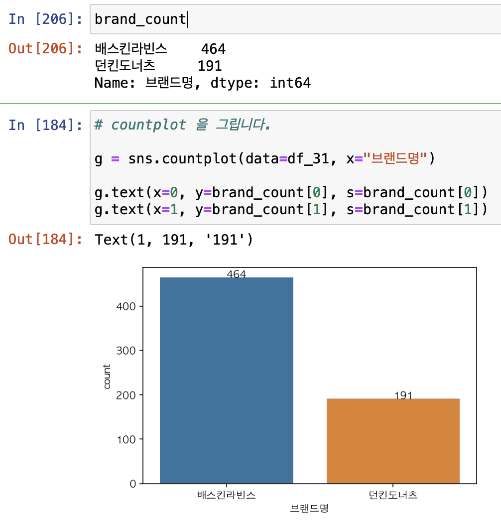 그래서 brand_count.index 를 출력해 보면 배스킨라빈스와 던킨도너츠가 출력될거에요.