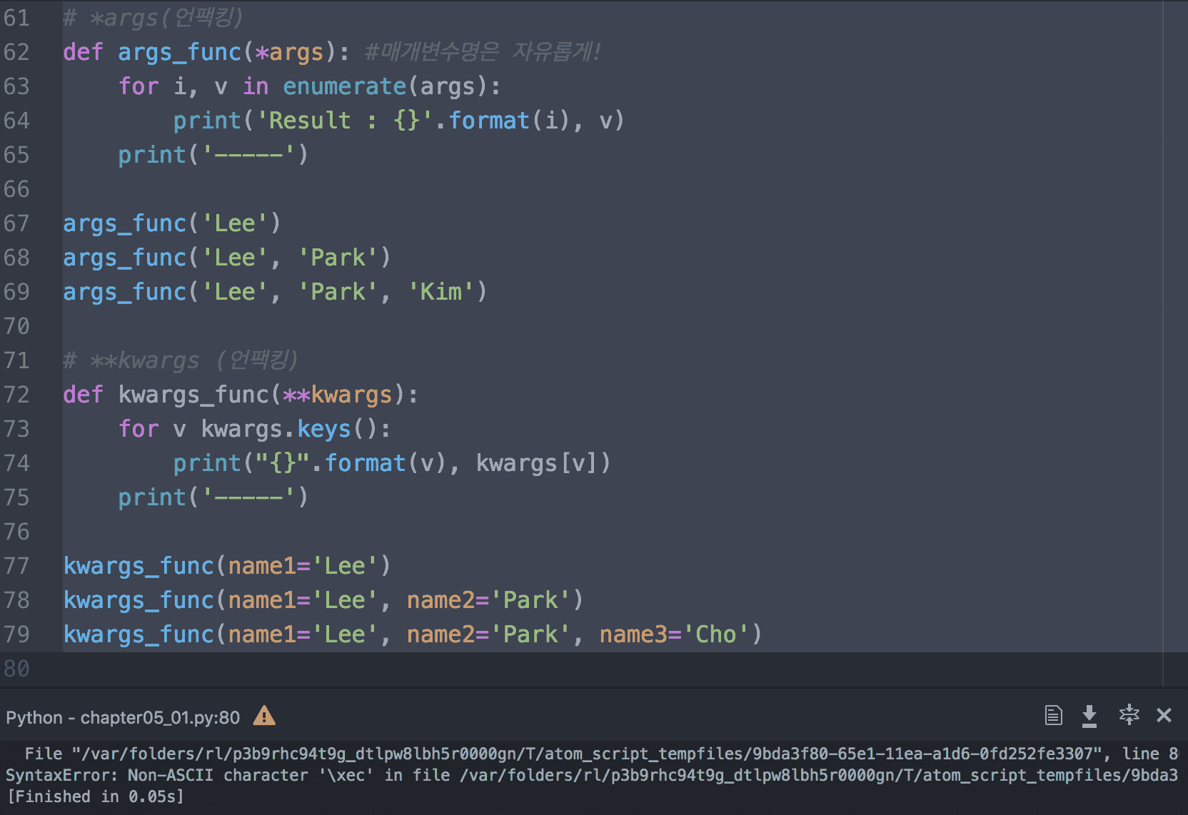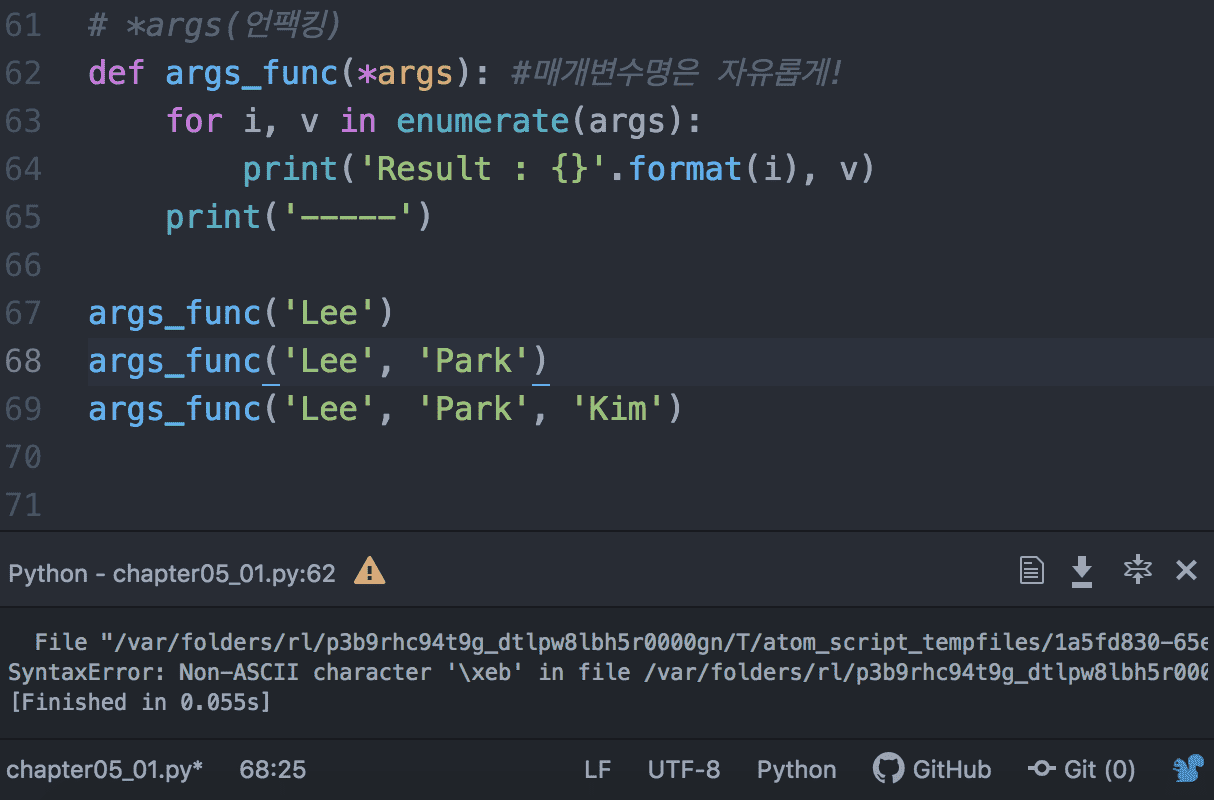 강의내용과 똑같이 *args언팩킹 코드를 작성했는데 실행되지 않는다는 오류가 나오네요ㅠㅠ