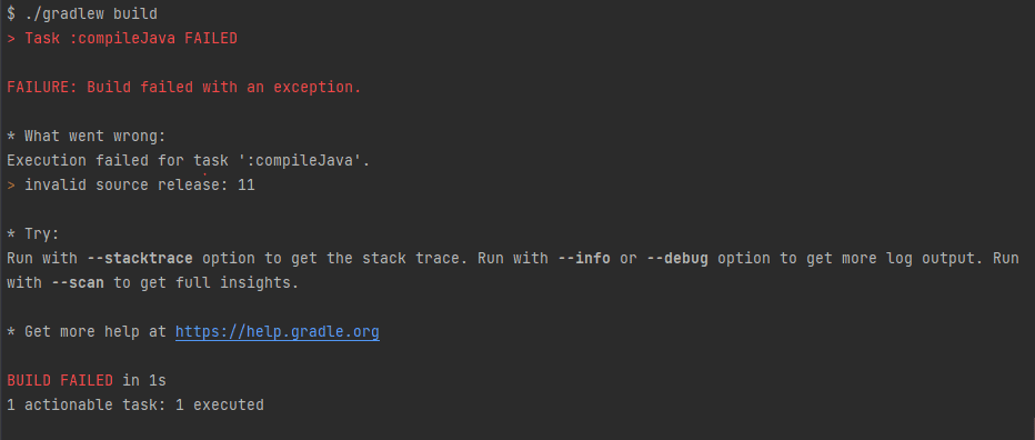 Gradle이 실행하는 자바 버전에 뭔가 문제가 있을 듯 한데요.