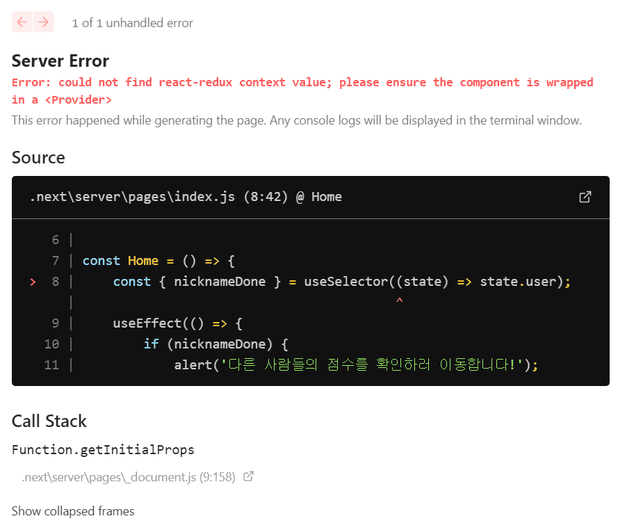 제로초님 깃헙에서 그대로 갖다썼는데도 계속 같은 에러가 발생하네요...아무리봐도 이유를 모르겠습니다ㅠㅠ 하루종일 이 에러만 보니 정신이 혼미해지네요