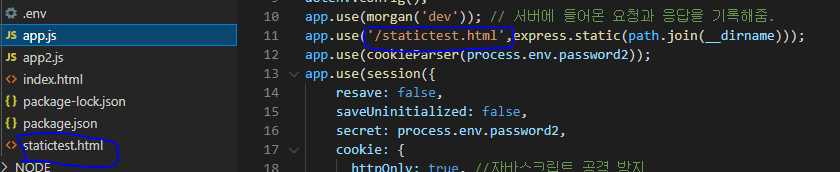 아뇨 static을 잘못 쓰셨습니다. express.static(폴더경로)입니다. 지금은 특정 파일을 쓰셨습니다. 그래서 static이 적용이 안 됩니다. statictest.html을 서빙하고 싶으시면 __dirname까지만 쓰시면 됩니다. 다만 이 때 프론트 주소는 /statictest.html 입니다.
