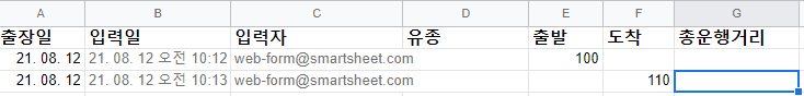 2) 아니면 출장일과 입력자가 같은 행의 경우, 총운행거리 셀에 도착 - 출발을 한 숫자 기록