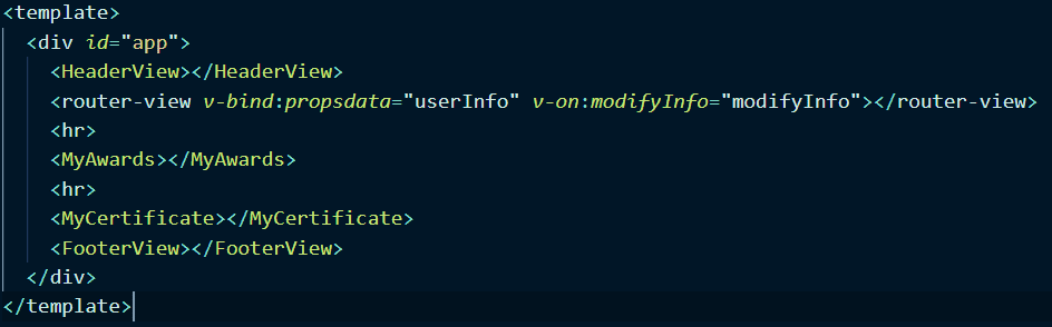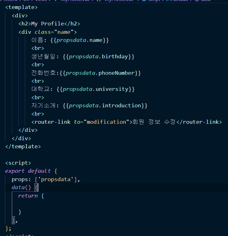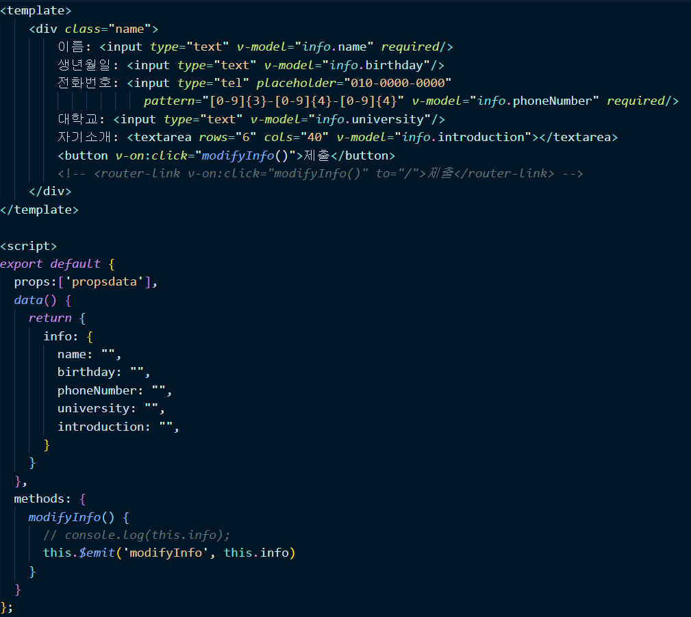 이 부분이 라우터가 '/'일때의 화면입니다. propsdata로 잘 받아와집니다. 그리고 수정페이지에서 정보를입력하고 제출하면 app.vue에서 변경이 됩니다.
