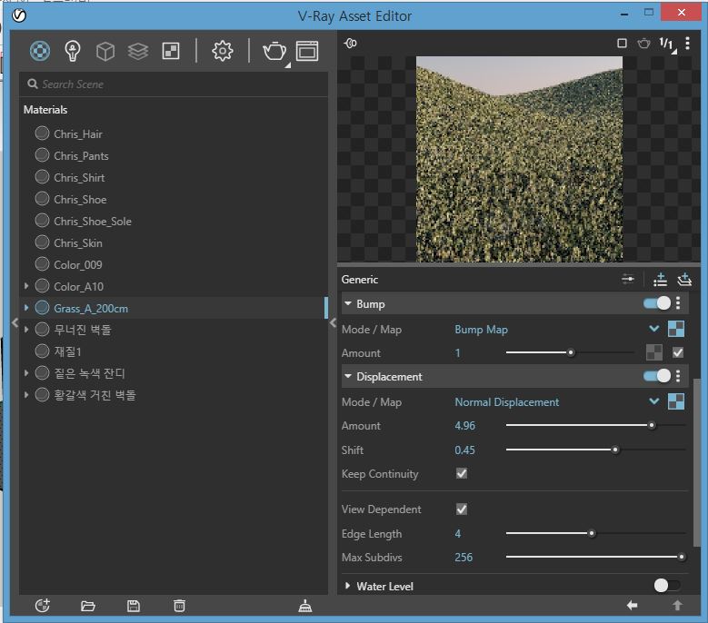 bump는 적용이 되었습니다만, displacement가 적용 되지 않아요. 설정값은 아래와 같습니다. bump는 켜도, 꺼도 렌더링값은 아래와 같았습니다.