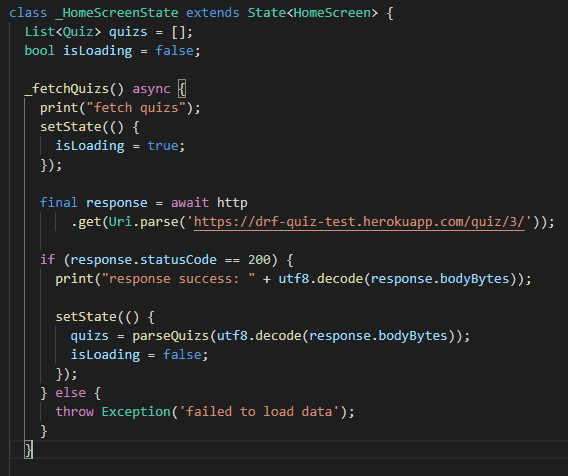 메인에서 퀴즈풀기 버튼 누르면 _fetchQuizs함수 호출까지는 되는 것 같은데 http.get 다음으로 넘어가지 않습니다.