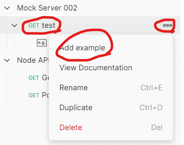 request를 추가하고 나면, 추가된 request 옆에 있는 더보기 아이콘을 클릭하면 Add example 메뉴가 있습니다.