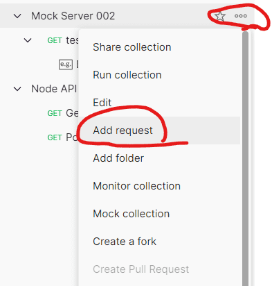 Mock 서버 옆에 있는 더보기 아이콘을 클릭한 후 Add request 메뉴를 클릭해서 새로운 API를 추가할 수 있습니다.
