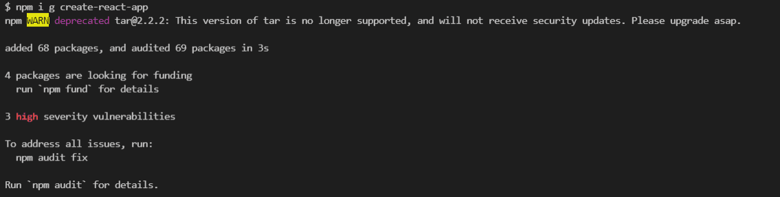 npm WARN deprecated tar@2.2.2: This version of tar is no longer supported, and will not receive security updates. Please upgrade asap.
