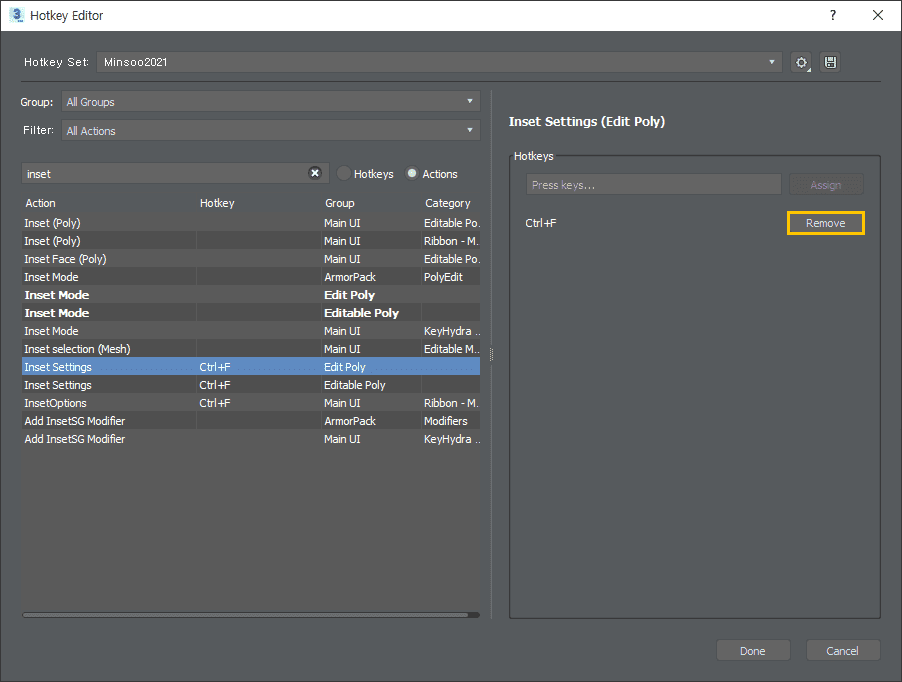 오른쪽 창에 기존 단축키를 지우는 버튼이 있습니다. 그걸로 지우시면 됩니다.