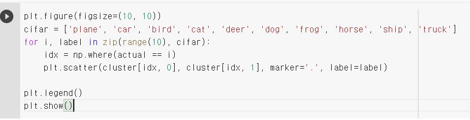 예 맞습니다. 실제값을 0부터 9까지 차례대로 받아 for문이 한 번 돌 때마다 클래스 하나에 대한 데이터를 그리는 것입니다. 그리고 cluster는 t-SNE의 결과값으로 2차원으로 차원 축소 된 좌표를 모아놓은 배열입니다. 즉, 2개의 점 정보가 들어있는 것이고 0(0열)은 x좌표, 1(1열)은 y좌표가 됩니다.