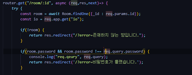 저기서 if(room.password && room.password !== req.query.password) 부분이 뭐가 잘못된거 같은데