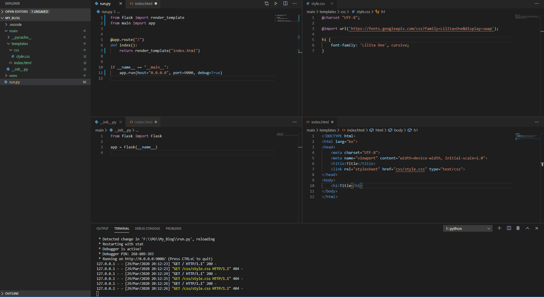 구글 폰트를 적용시키려고 해봤는데 run.py를 구동시키지 않고 index 파일을 웹페이지에서 실행해보면 CSS가 적용이