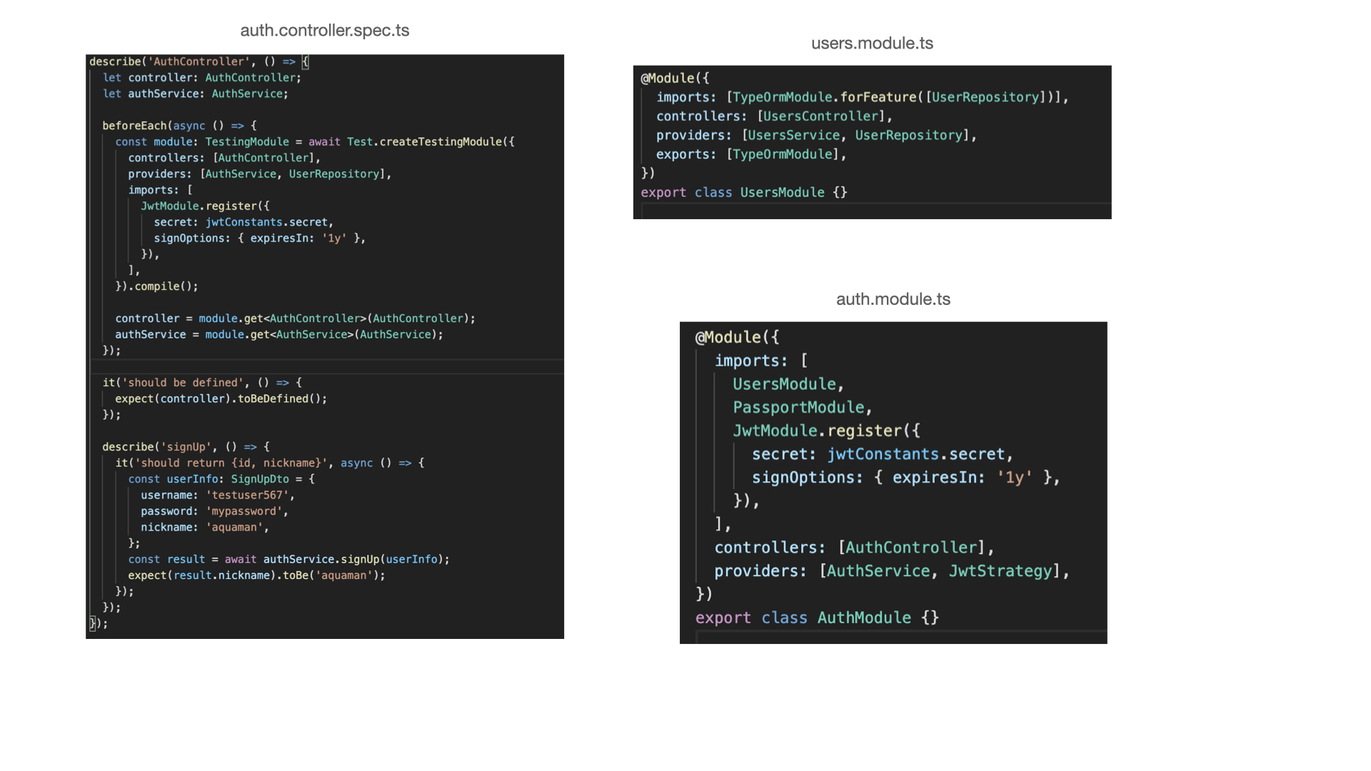 그런데 auth/auth.controller.spec.ts에서 테스트를 해볼때 에러가 나는데 설정관련해서 햇갈리는 부분이 있어서 질문드립니다.
