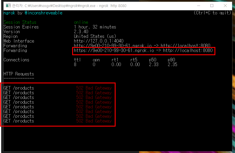 ngrok은 기본적으로 자신에게 온 요청을 다른 서버에게 넘겨주는 '포워딩' 역할을 수행하는데요. 현재 넘겨주는 서버가 제대로 동작하지 않을 때 502 상태 코드의 HTTP ERROR를 뱉게 됩니다.