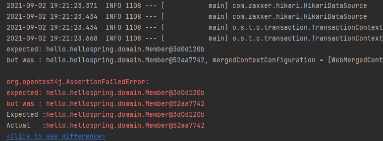 직접 올려주신 스크린샷을 보면 expected와 actual에 찍힌 member의 참조값(@이하 문자열)이 서로 다름을 알 수 있습니다.