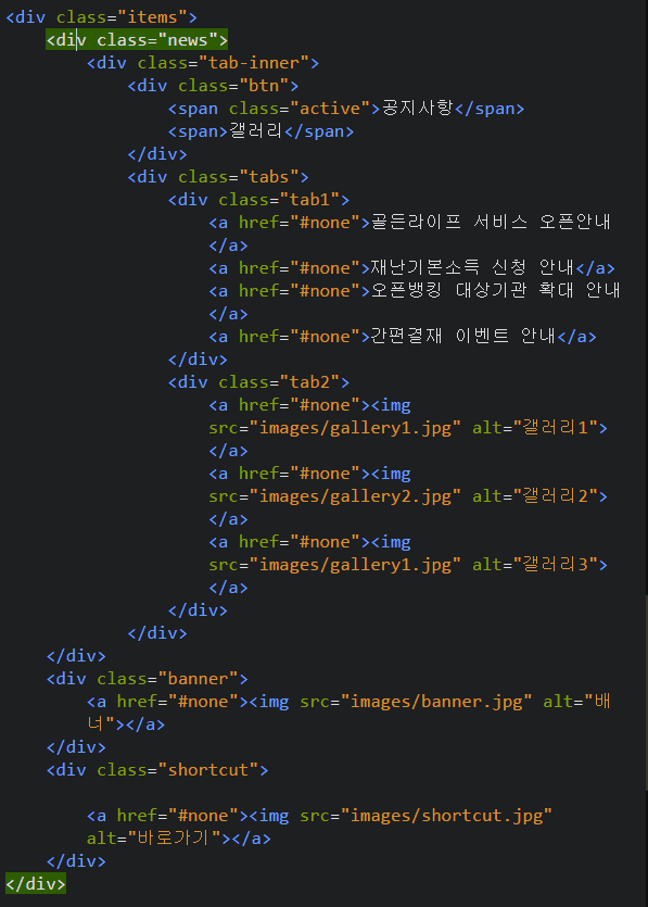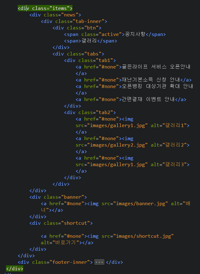 공지사항 갤러리 탭 하는 과정에서 이렇게 배너부분과 바로가기 부분이 공지사항 div 뒤로 숨어버렸어요