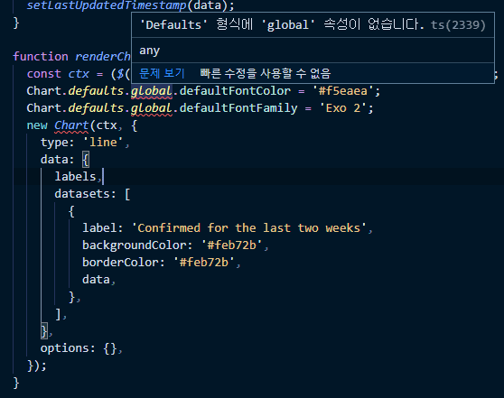 안녕하세요 paen님, 오류 내용을 자세히 첨부해 주셨는데 첨부해 주신 내용만으로는 디버깅이 좀 어려울 것 같습니다. chart.js 라이브러리가 3.5.x 버전 이상부터는 타입 선언 파일을 자체적으로 제공하는 것으로 알고 있어서 별도의 타입 선언 라이브러리를 설치안하셔도 타입 오류가 안날텐데요. 해당 부분 확인해 보시겠어요? :)