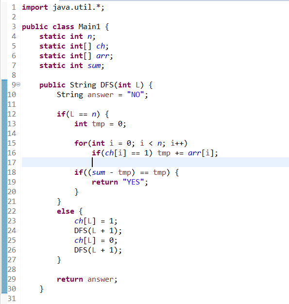 DFS 함수를 void 반환으로 하지 않고 String 형으로 바꾼 뒤에 부분집합 합이 동일할 때 YES 를 return 하는 방법으로 코드를 작성했는데 답이 NO로 나옵니다. 분명 if((sum - tmp) == tmp) 문 안으로 들어오긴 하는데 왜 YES를 반환하지 못하는지 궁금합니다.
