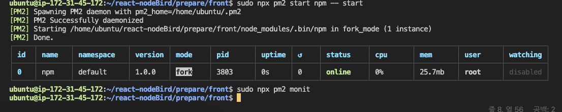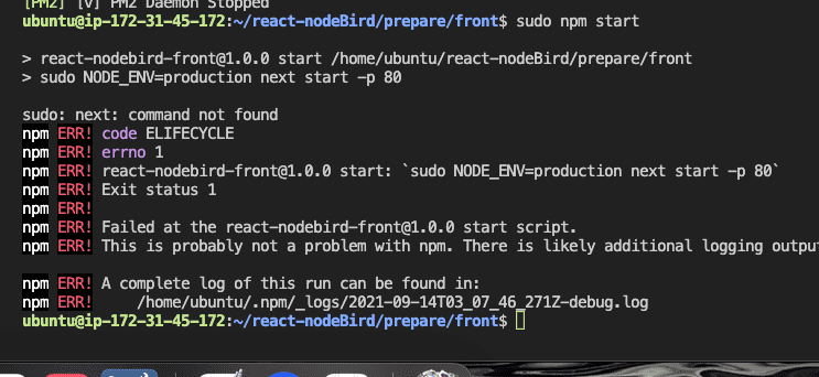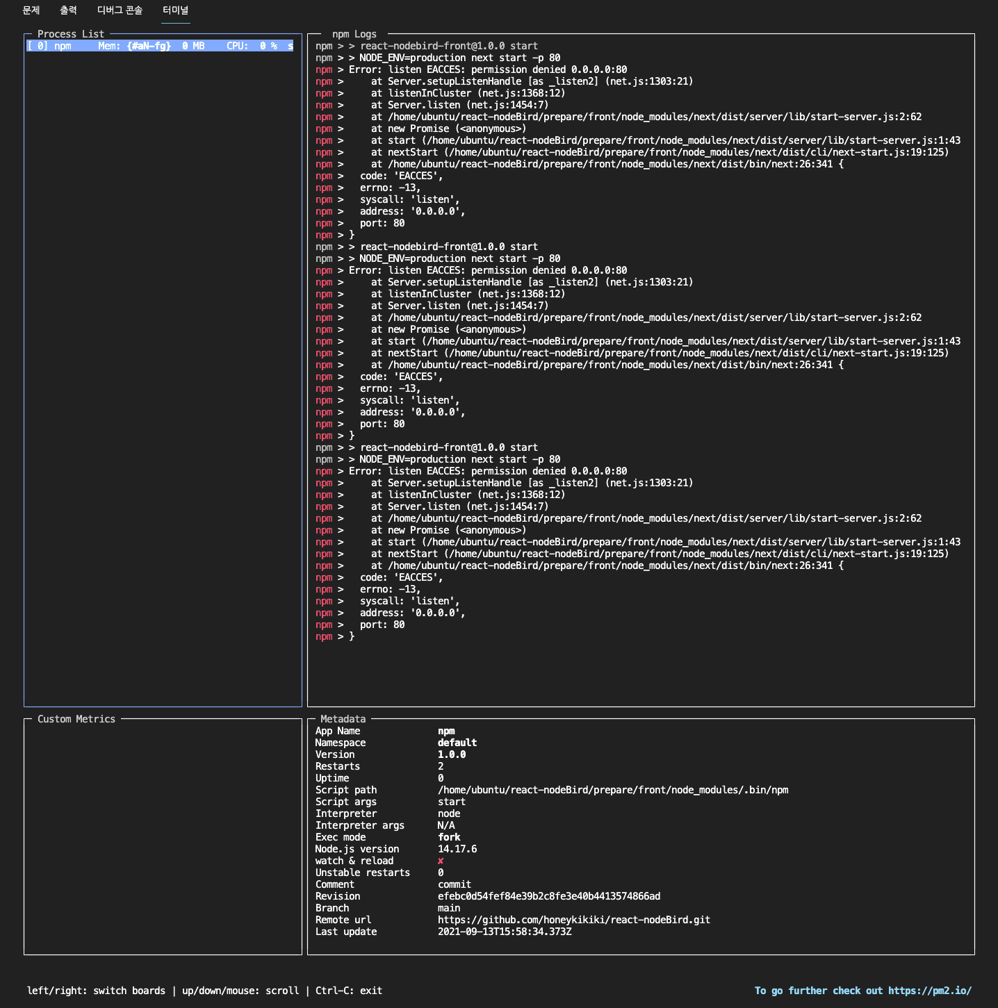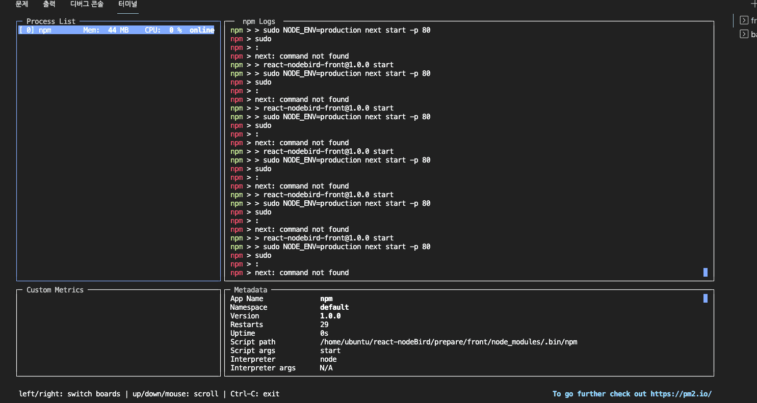 sudo npx pm2 start npm -- start && sudo npx pm2 monit 사용후 에러입니다