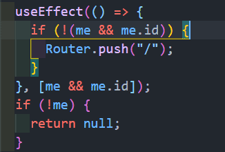 안녕하세요, login 안 한 상태 혹은 logout 한 상태에서 profile page로 접근하는 것을 막아주기위해 했던 Router.push를 useEffect안에 선언한 것은 이해가 되는데, 그 밖에서 다시 if(!me){return null} 을 선언 해주는 이유가 궁금합니다. profile 함수라서 무조건 뭔가를 return 해줘야 하기 때문인가요?