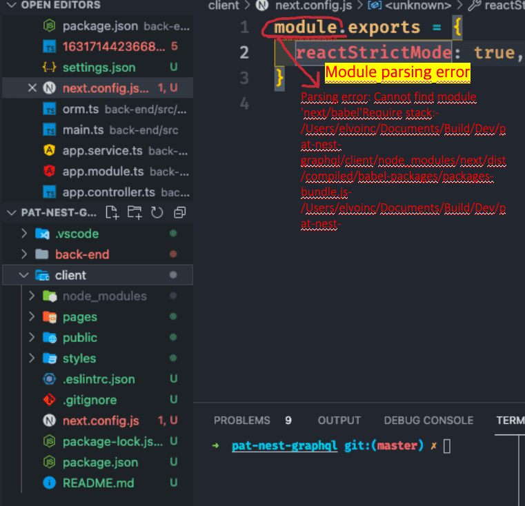 ㅇ프로젝트 폴더에 / back-end /client 폴더를 각각 만들고 client 폴더 안에 nextjs 를 설치했습니다. 그런데 next.config.js 파일안에 module에서 parsing error가 발생합니다.이 강좌와 관련이 없지만 혹시 시나 아신다면 도움 바랍니다.