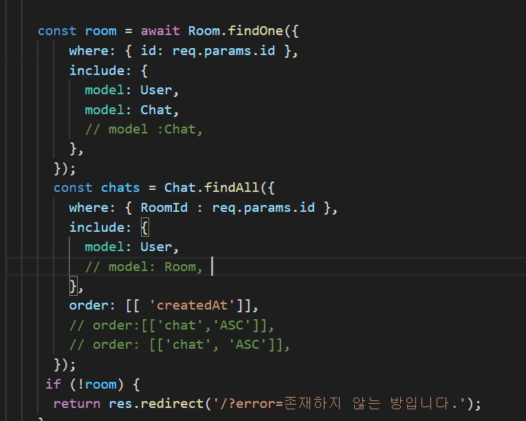 채팅이 안 불러와지는 거 아니신가요? 첫번째 코드에서 if (!room) 위에 chats 불러오는 코드가 있는데 거기서 제대로 불러와서 프론트에 전달되고있는지 체크해야겠죠?