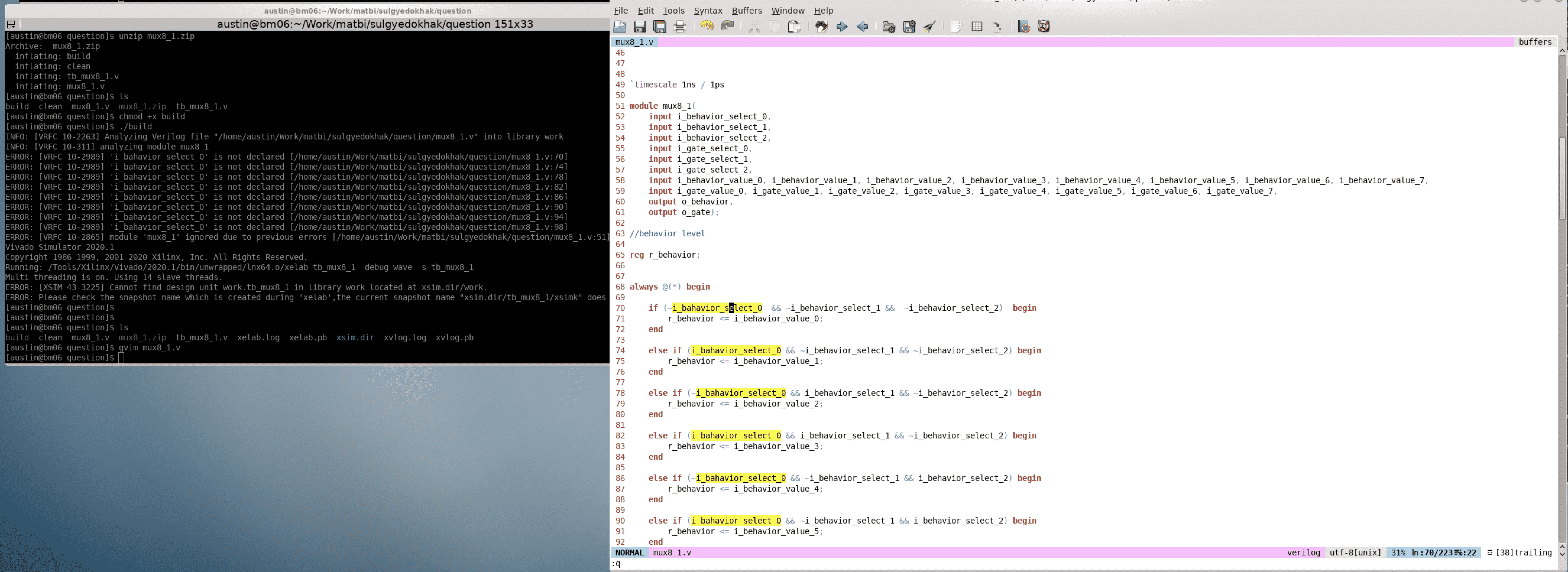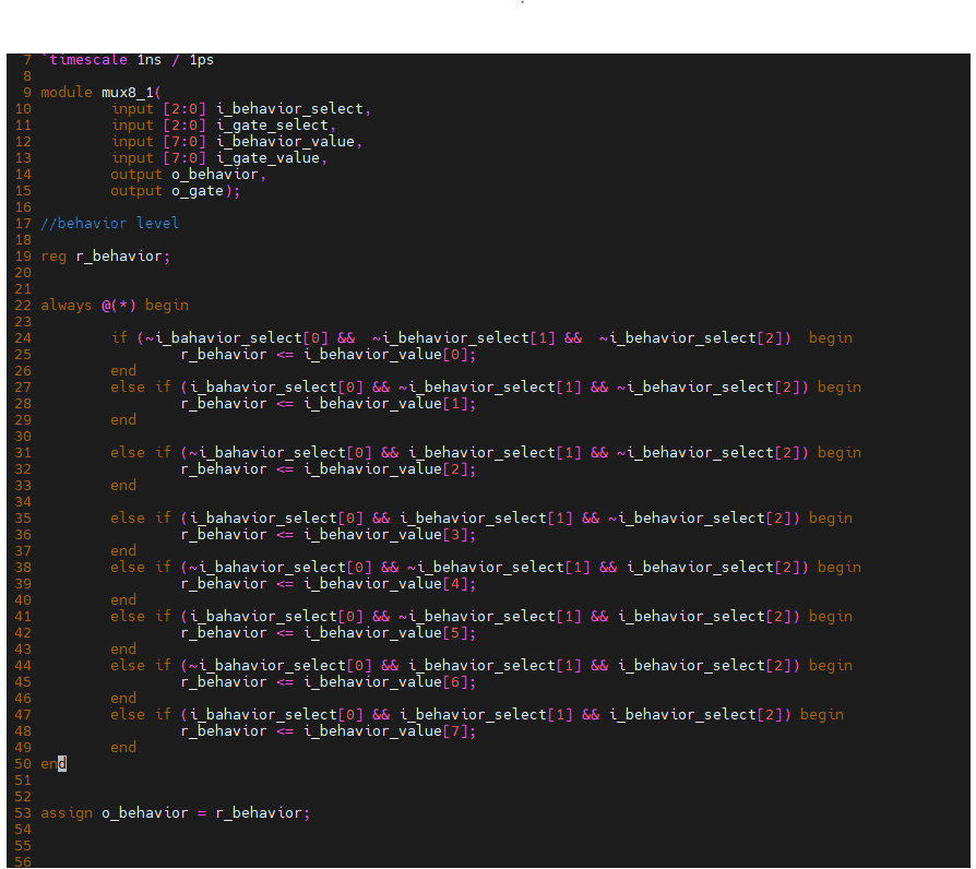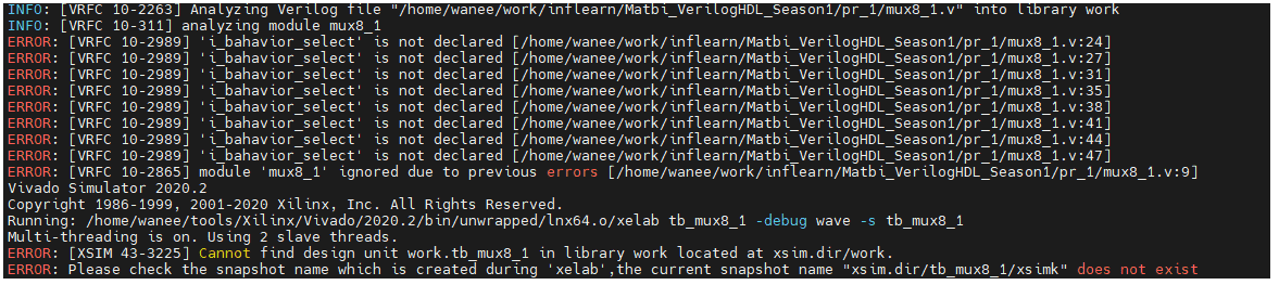 안녕하세요 선생님 Multiplexer (MUX 8 to 1) 를 혼자 만들어 보았는데 behavior레벨에서 i_bahavior_select 신호를 만들었고 (3비트) select 신호에 따라 if 구문에서 조건을 만들어서 input 값을 출력하는 코드를 작성중에 있었는데 위의 에러 처럼 select신호가 선언 안됐다고 여러 방향에서 수정을 하였지만 선언이 안됐다는 말이 되풀이 됩니다.. 혹시 코드 어느 부분이 오류가 있는지 여쭙니다