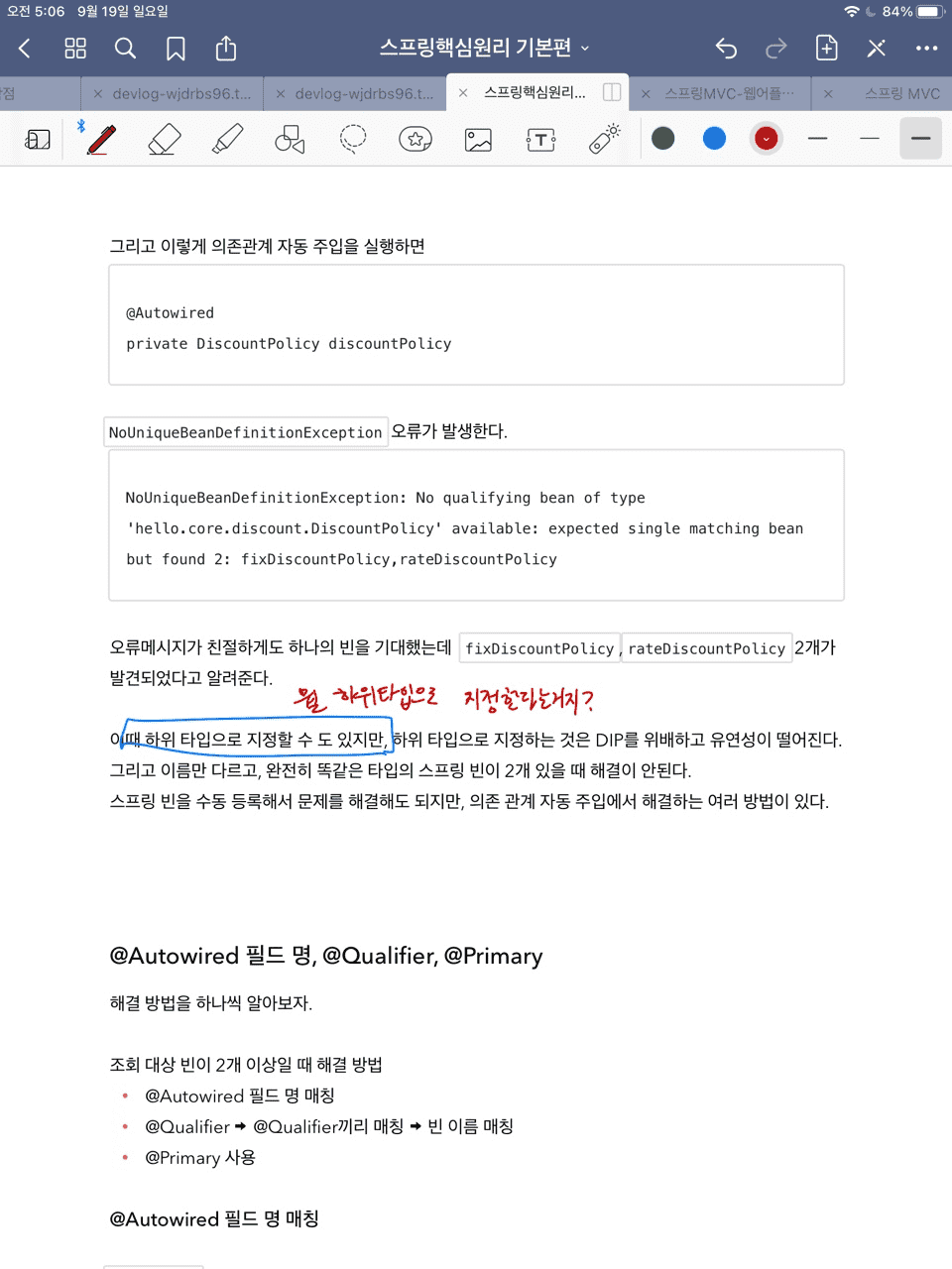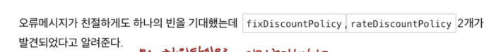 DiscountPolicy의 구현체가 2개여서 발생하는 문제에 대한 해결책으로 하위타입(구체적인 구현체 즉, fixDiscountPolicy 혹은 rateDiscountPolicy 타입으로의 선언) 타입으로 지정하는 것에 대한 내용을 설명하는 것으로 보면 됩니다.