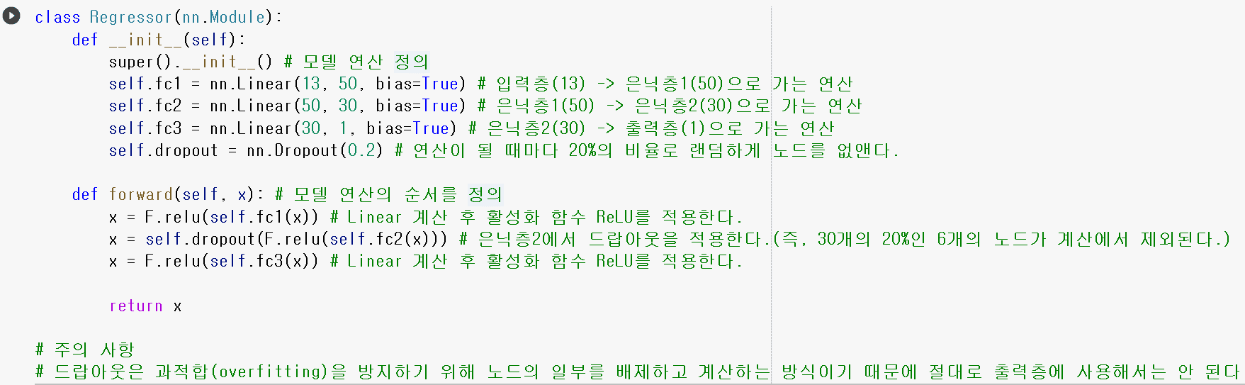 파이토치에서 제공하는 nn.Module의 특성을 상속받아 만든 클래스는 forward에서 바로 입력값을 받아 연산을 수행할 수 있습니다!!