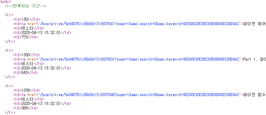 그러니까 위의 리스트가 출력되는 html 에서 board_view 링크에 search 와 keyword 값이 제대로 설정되어있는지부터 확인해보셔야 할듯 합니다. 브라우저에서 해당 검색 결과 리스트를 출력해놓은 상태에서 마우스 우클릭 > 소스보기를 하시면