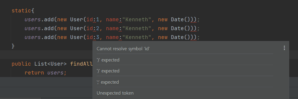올려주신 첨부 파일로 보아, id, name과 같은 필드명을 같이 입력하신 것 같습니다. 해당 필드명은 입력하는 것이 아니라, IntelliJ에서 자동으로 매핑해서 보여주는 기능입니다. 아래와 같이 입력해 보시기 바랍니다.