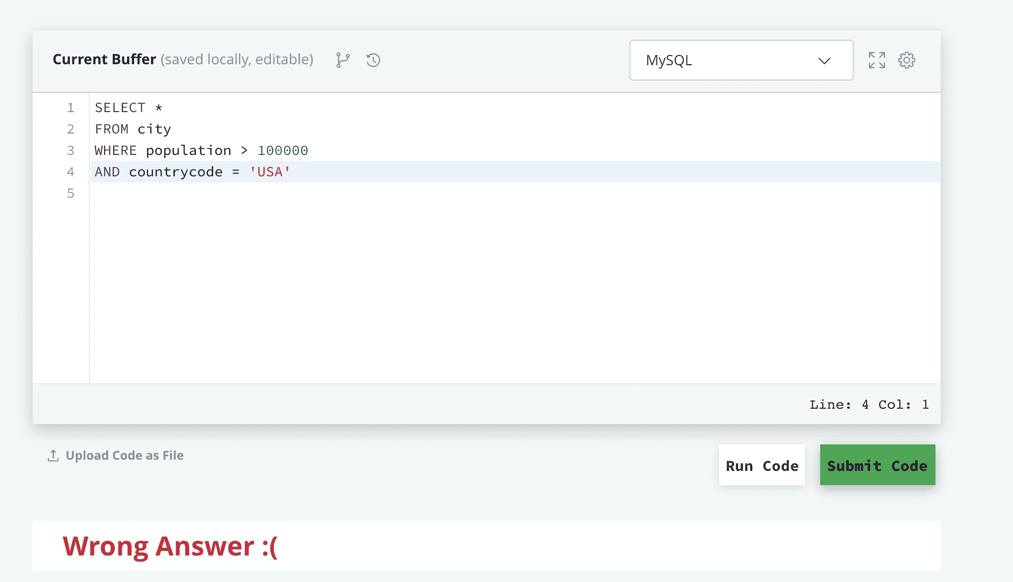 현재 진행하고 계시는 문제는 쿼리 2문제이신 것 같은데...입력하신 정답은 쿼리1번 문제의 답을 입력 하셔서 그런 것 아닐까 싶어요!
