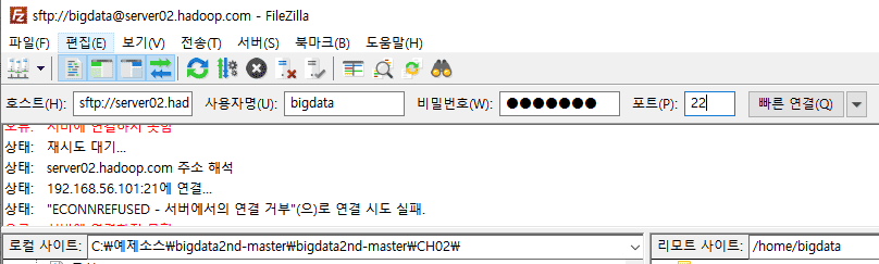 강의를 듣고 실습하는 과정에서 하둡과 주키퍼 명령 강의파트에서 파일질라에서 server02에 올린 파일이