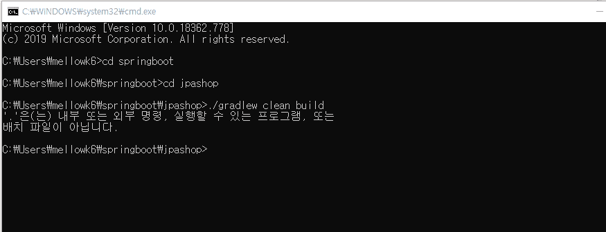 저는 윈도우 사용자인데 애초에 ./gradlew clean build 명령어가 먹질 않습니다. 캡쳐와 같이 배치파일이 아니래요