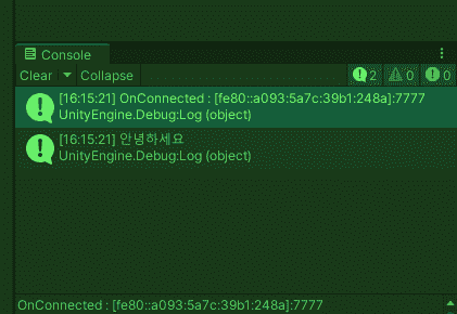 - 제가 만든 서버 프로그램과 선생님이 만드신 유니티 프로그램과 연동했더니 안녕하세요가 출력되었기 때문입니다.