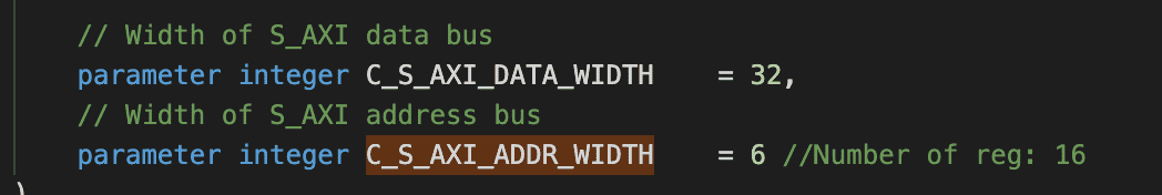 수업 중에 C_S00_AXI_ADDR_WIDTH를 4에서 6으로 변경해준 이유는 16로 늘어난 reg 갯수를 커버하기 위함이라고 하셨는데....