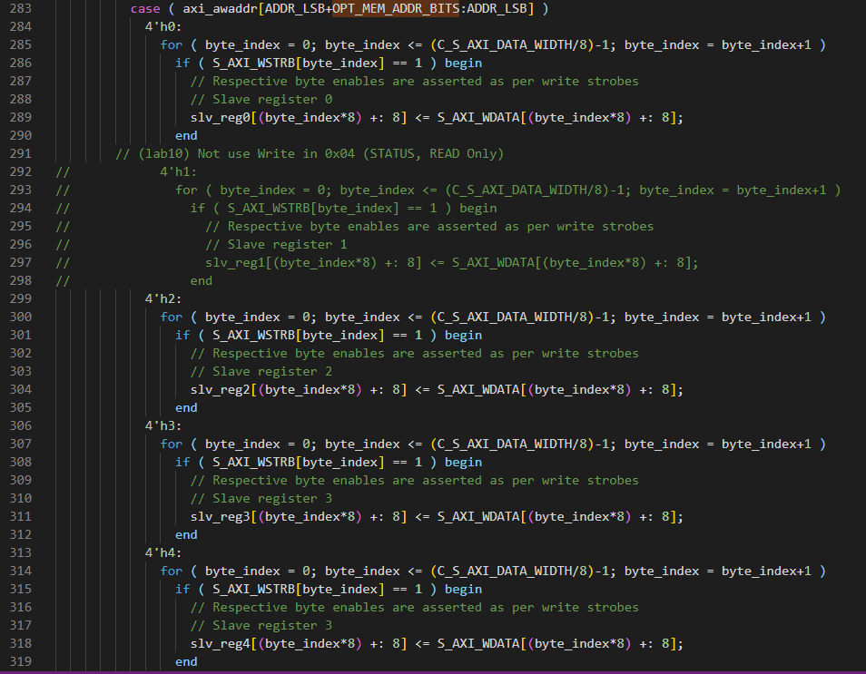 여기서는 우리가 16개의 reg를 사용하였기 때문에 axi_awaddr[2+3:2]이 되는 것은 이해하였습니다.